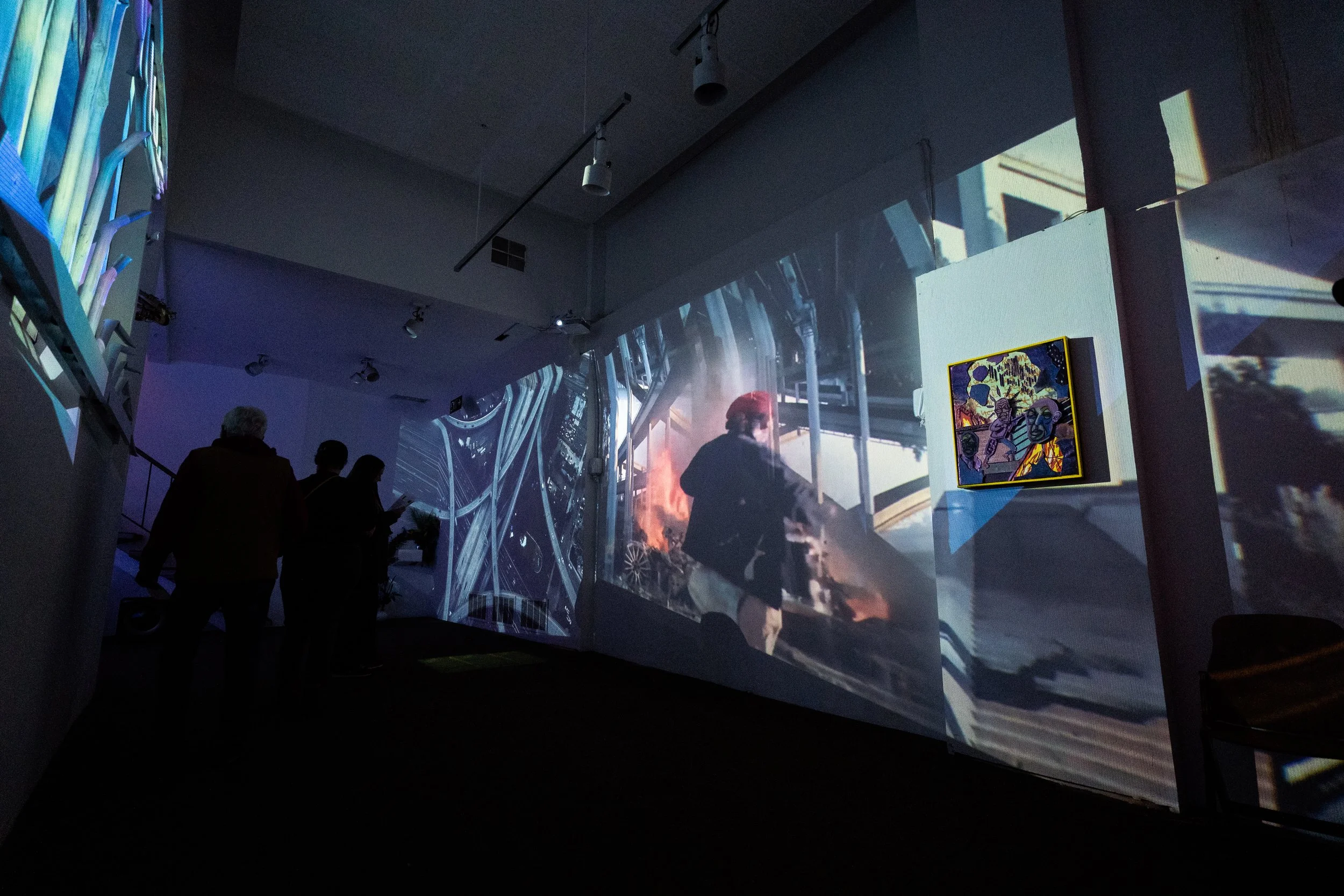 Visual projections cover the space from floor to ceiling, pulsing between the concrete and immaterial. Footage of protest, prison and city scape mirror each other connecting the foundational violence of the US, the carceral state, and the concrete landscapes we continue to find ourselves trapped within.
