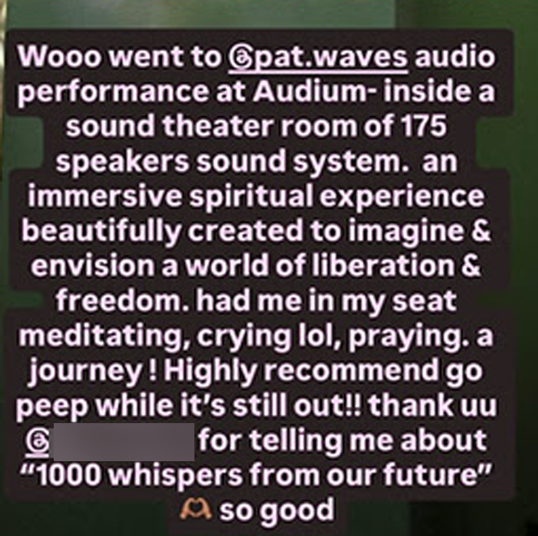 1000 Whispers From Our Future is an auditory excursion that transcends the confines of our physicality and ascends listeners into the waves of the infinite. It pulls from Pat Mesiti-Miller’s near-decade of work inside California prisons, and features the sounds of the physical structures of incarceration, the sounds of life inside them, and the power of our collective imagination and spirit.